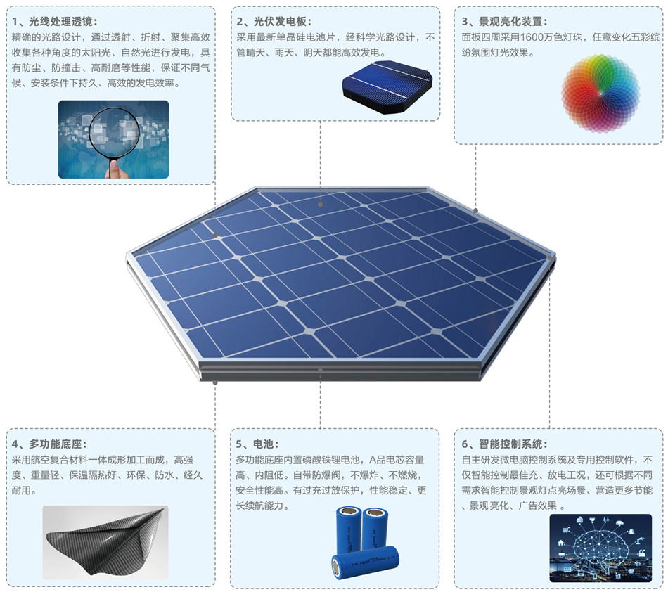 ①采用模塊化設(shè)計、可任意拼裝,進行科學光路設(shè)計對各種角度的太陽光進行折射、聚焦后再高效發(fā)電,光線利用率比普通光伏高30%以上;