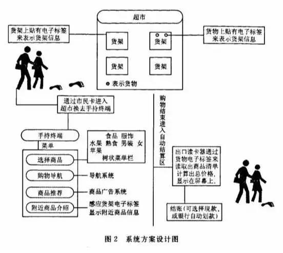 隨著社會的發(fā)展,超市已經(jīng)成為了人們?nèi)粘I畹囊徊糠帧3兄械奈锲贩N類繁多,人們可以在超市中購買到任意所需商品。然而商品種類的增多給人們選購商品帶來了一定的影響,人們可能會花大量的時間在尋找商品上。本方案意在讓顧客在智能超市中感受到物聯(lián)網(wǎng)給人們生活所帶來的便捷,明白何為物聯(lián)網(wǎng)及物聯(lián)網(wǎng)對人們生活的影響。智能超市讓顧客不再為購物找商品和排隊結賬而苦惱。因此,構建超市購物引導系統(tǒng)具有較大實際意義。電子標簽和物聯(lián)網(wǎng)的出現(xiàn)使得工業(yè)企業(yè)物聯(lián)網(wǎng)系統(tǒng)得以實現(xiàn)。電子標簽是用來識別物品的一種新技術,它是根據(jù)無線射頻識別原理(RFID)而生產(chǎn)的,它與讀寫器通過無線射頻信號交換信息,是未來識別技術的首選產(chǎn)品。物聯(lián)網(wǎng)是在計算機互聯(lián)網(wǎng)基礎上,利用電子標簽為每一物品確定僅有識別EPC碼,從而構成一個實現(xiàn)全球物品信息實時共享的實物互聯(lián)網(wǎng),簡稱“物聯(lián)網(wǎng)”。物聯(lián)網(wǎng)的提出給獲取產(chǎn)品原始信息并自動生成清單提供了一種有效手段,而電子標簽可以方便地實現(xiàn)自動化的產(chǎn)品識別和產(chǎn)品信息采集,這兩者的有機結合可以使人們隨時隨地在超市中買到任意所需的商品。