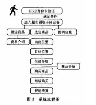 整個智能超市系統(tǒng)由身份識別、搜索導航、信息讀取、廣告推送、智能清算5部分組成。