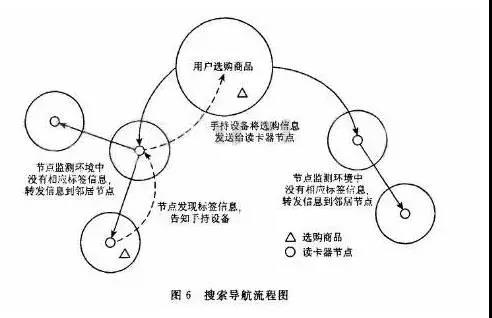 當選擇好商品后,手持設備將購置信息傳給讀卡器節(jié)點,讀卡器節(jié)點讀取其監(jiān)測環(huán)境中的標簽信息,如果某讀卡器節(jié)點范圍內(nèi)沒有相關物品信息,則傳送信息給其鄰居讀卡器節(jié)點,直到找到相關物品。同時將物品的位置信息返回手持設備,獲取當前位置信息和物品信息,自動選擇一條最優(yōu)路徑引導顧客購物。搜索導航流程圖如圖6所示。