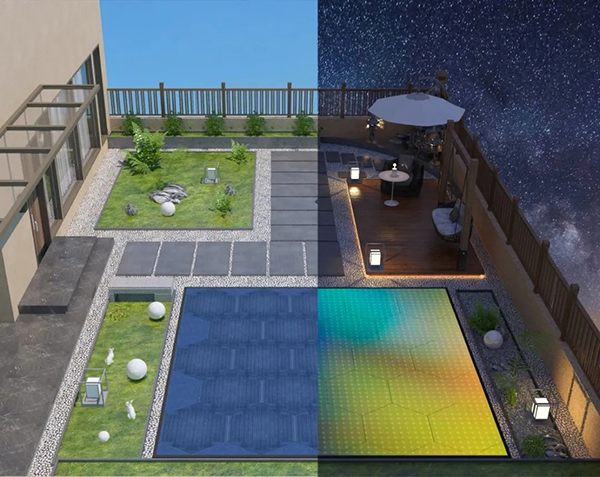 光能寶盒發(fā)電地磚設(shè)計(jì)承重高達(dá)1噸/平方米,可上人,不影響屋頂露臺(tái)、花園人行通道、人行廣場(chǎng)的使用空間;光能寶盒發(fā)電地磚白天發(fā)電,夜間多種景觀亮化模式,應(yīng)用場(chǎng)景廣泛,是高端別墅的理想選擇!