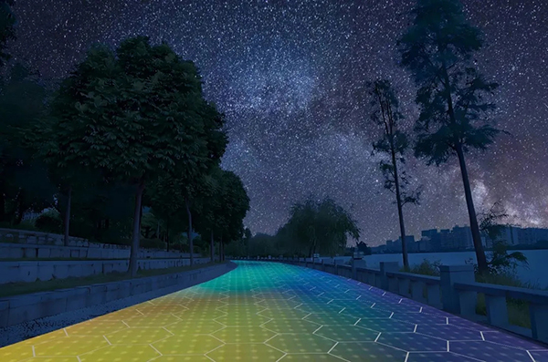 ▲環(huán)湖路光能寶盒發(fā)電地磚夜間景觀亮化效果
