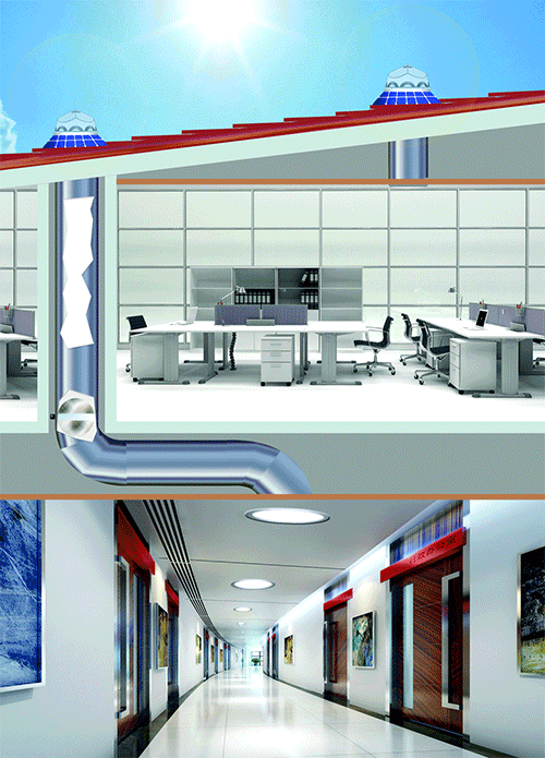 另外無電照明系統(tǒng)通過采光罩的折射、透射、聚焦等原理將光線高效的收集,經(jīng)由導(dǎo)光管內(nèi)表面高效反射處理,再引到室內(nèi),由漫射透鏡對(duì)陽光進(jìn)行打散讓光線變的柔和、均勻照射到室內(nèi)各個(gè)角落。